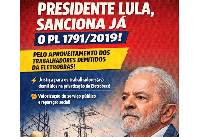 Atualização em 29/12/2025: O presidente Lula vetou o PL 1791/2019, em 29/12/2025, por falta de previsão orçamentária. Não desistiremos da luta! Ainda temos o PL 1189/23, que ao contrário do PL 1791, tem previsão orçamentária e já passou pela Comissão de Finanças e Tributação (CFT) da Câmara dos Deputados. A luta segue por justiça aos trabalhadores demitidos da Eletrobras sem justa causa, após a privatização.